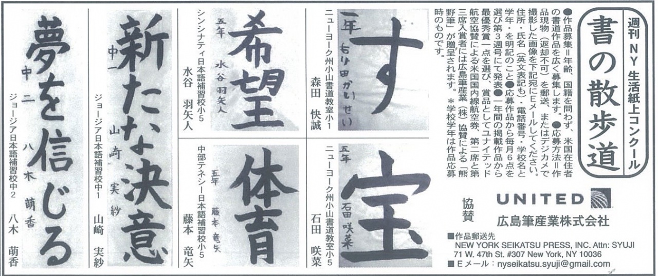 2020年9月19日 土曜日 筆 「週刊NY生活」の紙上書道コンテスト。9月の優秀作品発表。 当社が協賛しているNYの「週刊NY生活」の紙上書道コンテスト。 9月の優秀作品を発表します。 年間優秀作品には副賞として当社の熊野筆の書道筆をお贈りします。 是非ご参加ください!