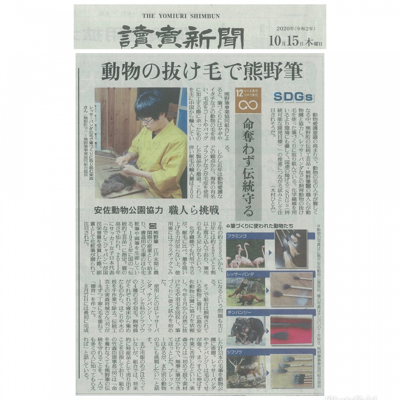 2020年10月15日 木曜日 筆 動物にも環境にも優しい「熊野筆」 本日(2020年10月15日)の読売新聞の朝刊で、動物の自然に抜けた毛で作る「熊野筆」について紹介されました。 動物にも環境にも優しく、そして動物との共存共栄が「熊野筆」の願いです。