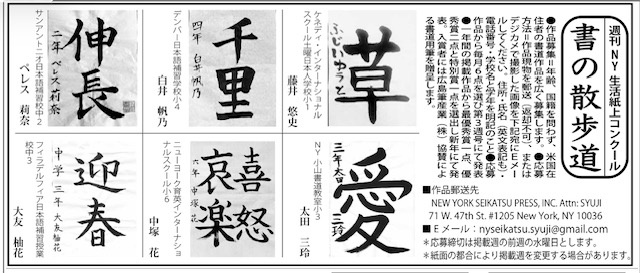 当社が協賛しているNYの「週刊NY生活」の紙上書道コンテスト。
