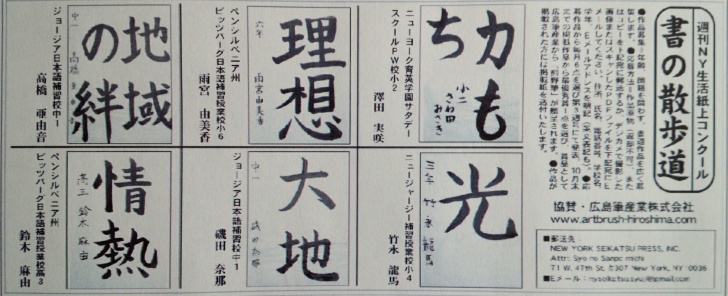 「週刊NY生活」の紙上書道コンテスト3月の優秀作品発表。