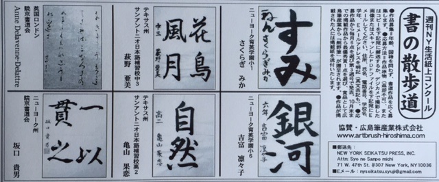 The excellent "shodo" (calligraphy) work announcement in July at the "shodo" contest in "Shukan NY Seikatsu" (Newspaper in NYC) which we sponsored.
