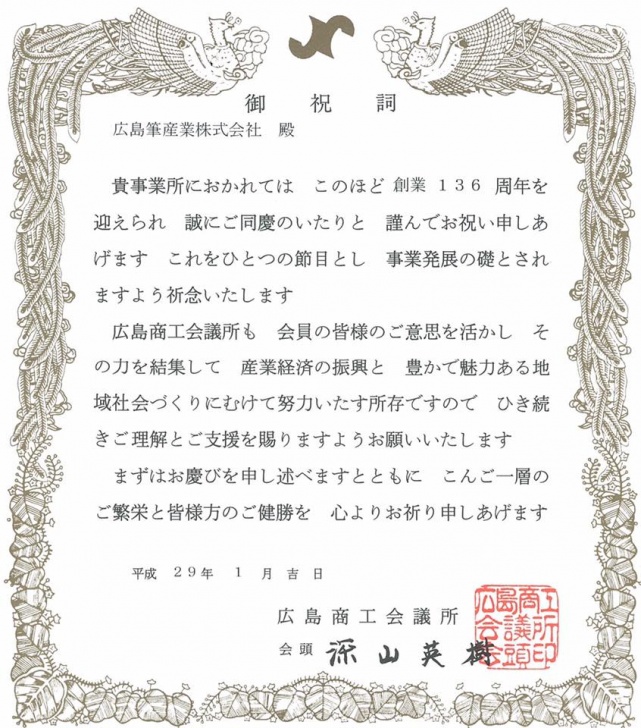 Our company was given official permission of "Fude Yui" (making and selling brushes) business from the Hiroshima prefecture and incorporated as "Shiromoto Shoten" in January 1881, and this month is 136th anniversary from the incorporation.