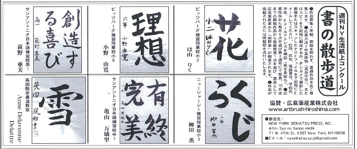 March 27, 2017 Shodo Contest in March at Shukan NY Seikatsu The excellent "shodo" (calligraphy) work announcement in March at the "shodo" contest in "Shukan NY Seikatsu" (Newspaper in NYC) which we sponsored.