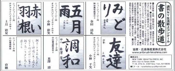 April 27, 2017 Shodo Contest in April at Shukan NY Seikatsu The excellent "shodo" (calligraphy) work announcement in April at the "shodo" contest in "Shukan NY Seikatsu" (Newspaper in NYC) which we sponsored.