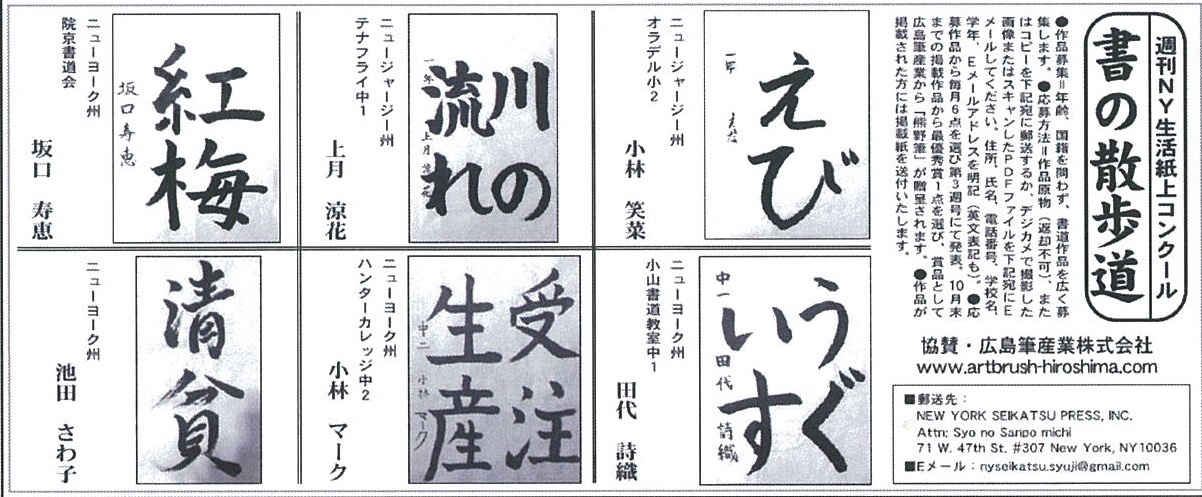 May 20, 2017 Shodo Contest in May at Shukan NY Seikatsu The excellent "shodo" (calligraphy) work announcement in May at the "shodo" contest in "Shukan NY Seikatsu" (Newspaper in NYC) which we sponsored.