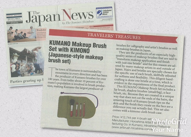 Our "KUMANO Makeup Brush Set with KIMONO" is introduced by an article in the "TRAVELERS' TREASURES" section of The Japan News by Yomiuri Shimbun on September 20, 2017.