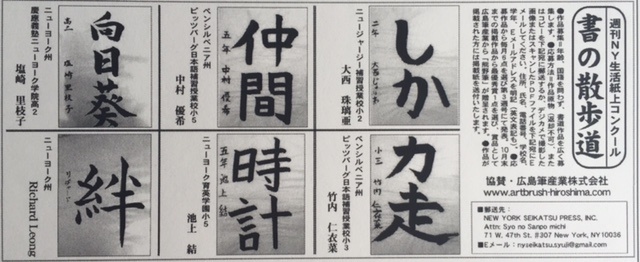 The excellent "shodo" (calligraphy) work announcement in August at the "shodo" contest in "Shukan NY Seikatsu" (Newspaper in NYC) which we sponsord.