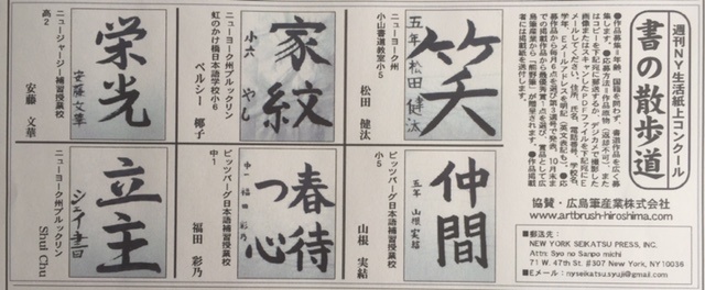 The excellent "shodo" (calligraphy) work announcement in February at the "shodo" contest in "Shukan NY Seikatsu" (Newspaper in NYC) which we sponsord.